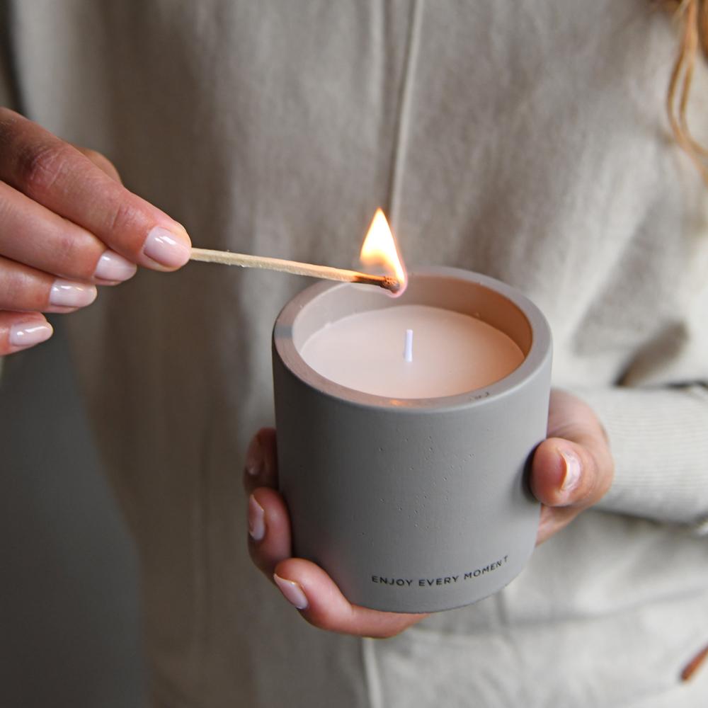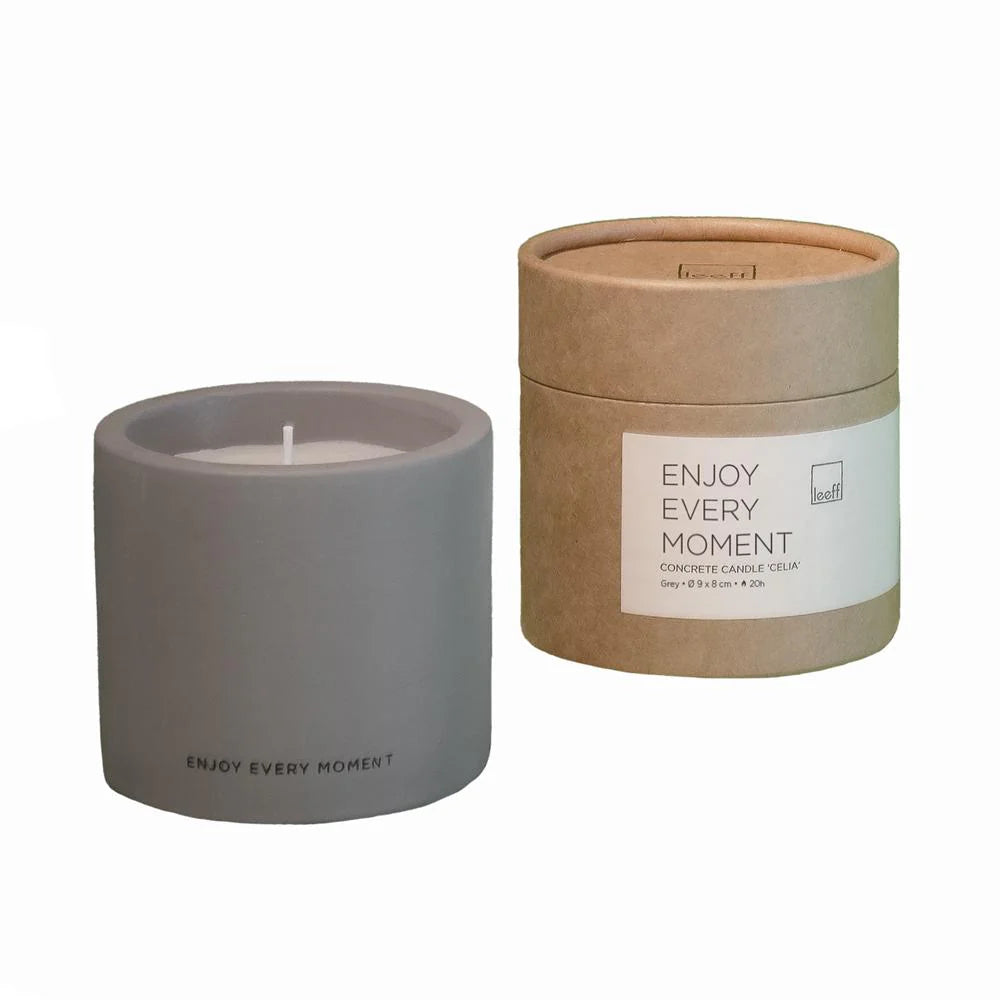 Breng sfeer en betekenis in je interieur met de Celia Kaars van Leeff. Deze kaars heeft een stijlvolle betonnen look en is voorzien van het inspirerende opschrift "Enjoy Every Moment", waardoor het niet alleen een sfeermaker is, maar ook een mooie reminder om het leven te omarmen. De kaars wordt geleverd in een elegante mooie koker, wat het een perfect cadeau maakt voor jezelf of een dierbare.