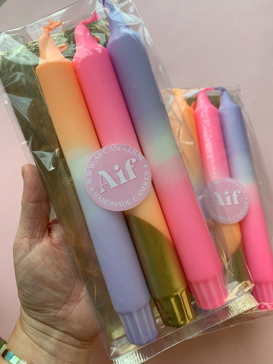 Haal de magie van een zomerse zonsondergang in huis met onze Sunset Trio. Deze handgemaakte kaarsenset in roze, oranje en lila met een subtiele gouden touch zorgt voor een speelse, warme sfeer. Een unieke combinatie van kleur en zachtheid – perfect als cadeautje of om zelf van te genieten. Past prachtig in onze kaarshouders!