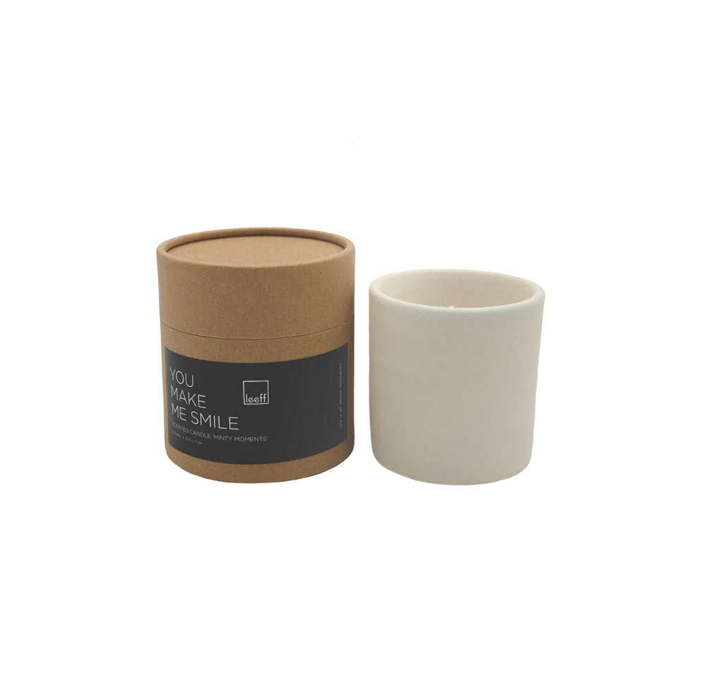 Breng frisheid en rust in huis met deze stijlvolle geurkaars van Leeff. De geur Minty Moments geeft een verkwikkende, lichte toets aan je interieur. Dankzij het zandkleurige keramiek en de quote “You make me smile” is deze kaars niet alleen heerlijk, maar ook een prachtig cadeautje.