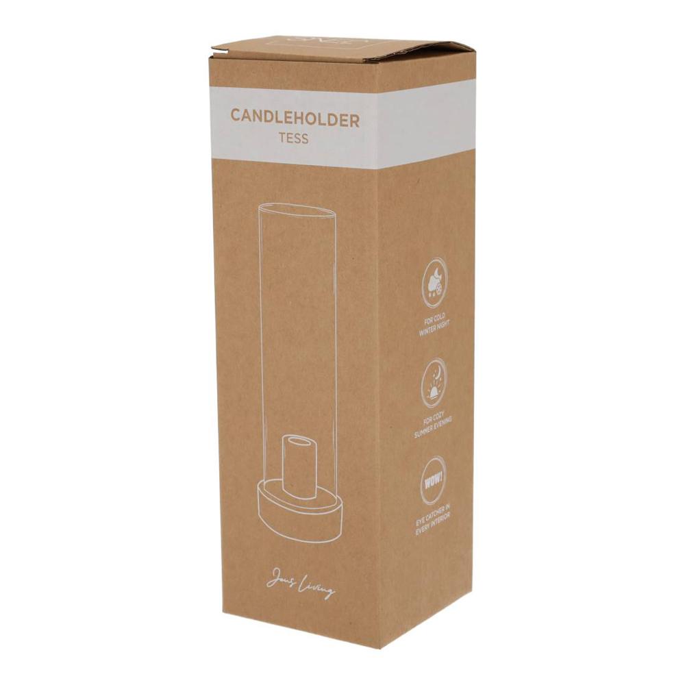 Dankzij de glazen cilinder is Tess ook ideaal te gebruiken als windlicht, zowel binnen als buiten. De kandelaar is geschikt voor dinerkaarsen en is voorzien van een verzonken rand die kaarsvet netjes opvangt – stijlvol én praktisch.
