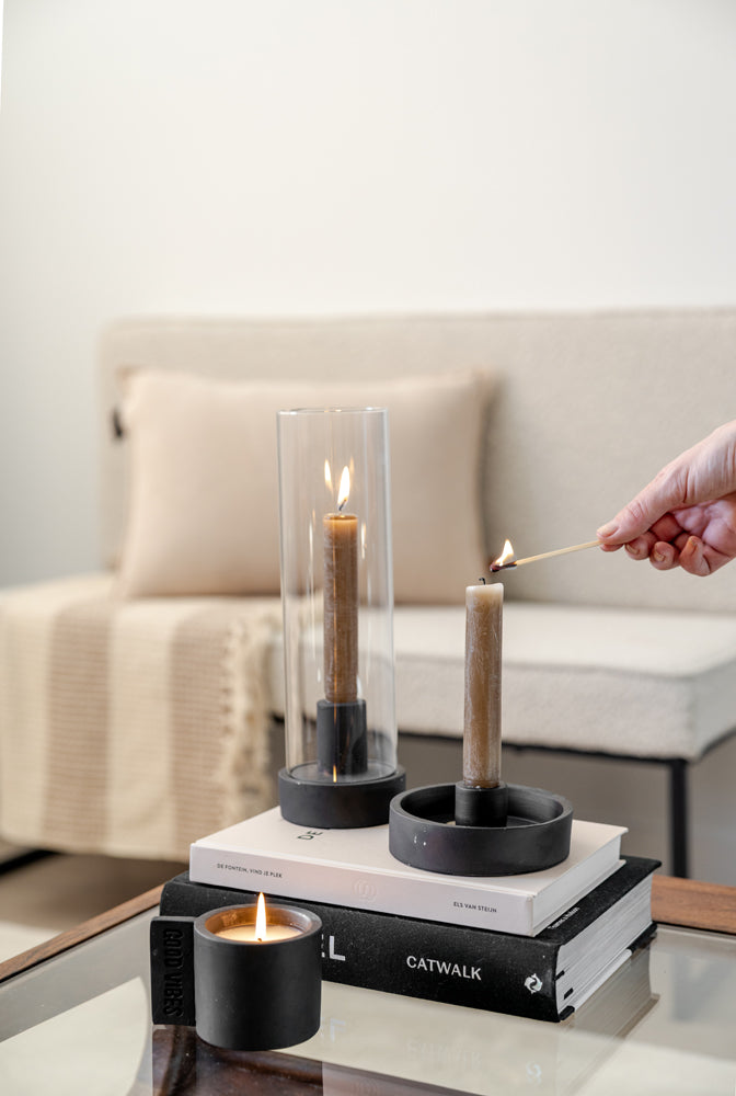 Kandelaar Tess in het zwart is een echte allrounder voor elk interieur. Gemaakt van massief beton en afgewerkt met een glazen cilinder, straalt deze kandelaar zowel rustiek als modern karakter uit. Dankzij het strakke, tijdloze ontwerp past Tess moeiteloos binnen elke interieurstijl – van industrieel tot Scandinavisch.