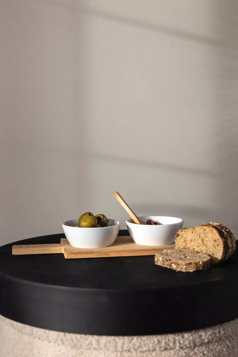 Maak van elk aperomoment een sfeervol ritueel met de Sunday 4-delige serveerset. Deze charmante set bestaat uit twee keramieken potjes, een houten serveerplankje en een bijpassend houten lepeltje – ideaal voor het presenteren van dips, tapenades, olijfjes of andere kleine hapjes.